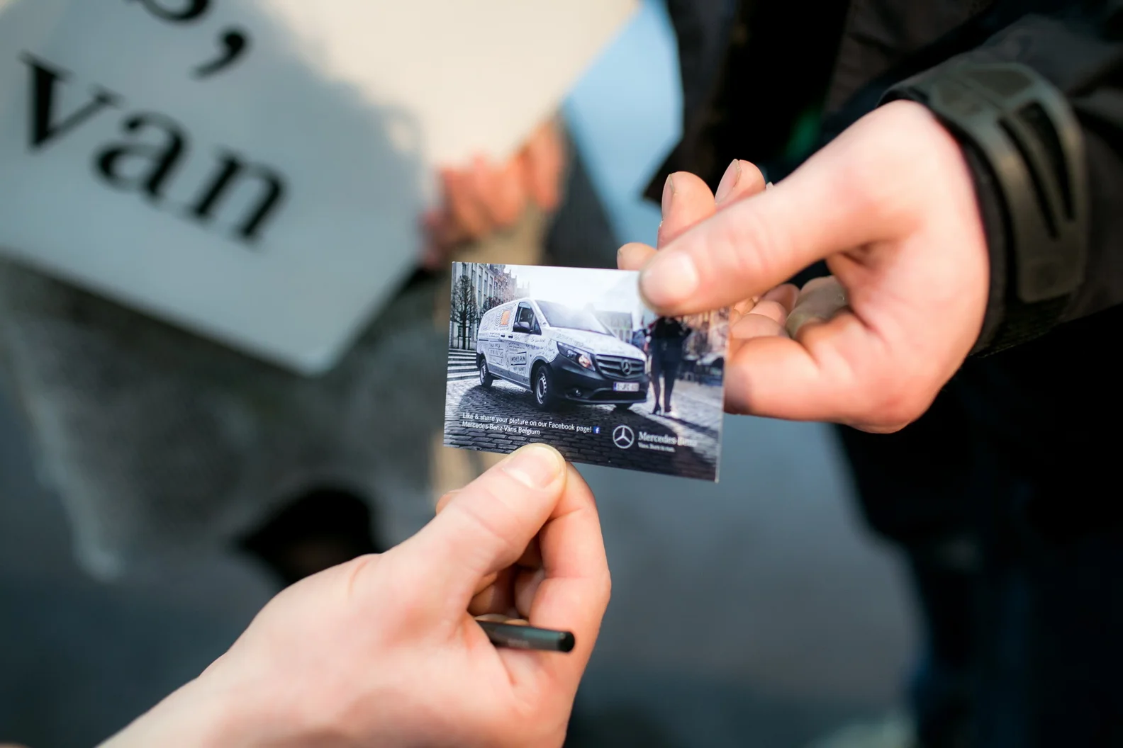 During the Brussels Motor Show, Mercedes-Benz gave the opportunity to the visitors to get immortalized in front of one of their Vans. A mobile-photographer was in charge to do so. Directly after, the participants validated their pictures and gave their consents to be projected on the big screen of the Mercedes-Benz stand. The participants received a webcard which invited them to find their pictures on the Mercedes-Benz Vans Belgium Facebook account.